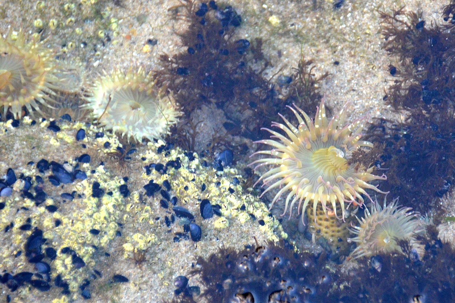 | tide pool, sea shore, low tide, intertidal zone, pacific ocean, white starburst anemone, california mussel, mollusc, smelt sands state recreation site, oregon |