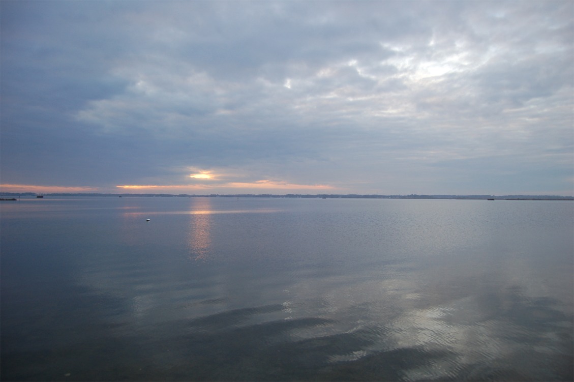 currituck sound sunset, reflection, light refraction, clouds, west |